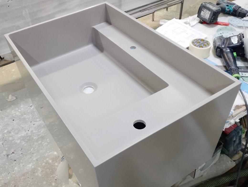 Для изделий из Kerrock возможно три варианта шлифовки: матовый, полуматовый и глянцевый. Для этой раковины клиент выбрал полуматовое исполнение.