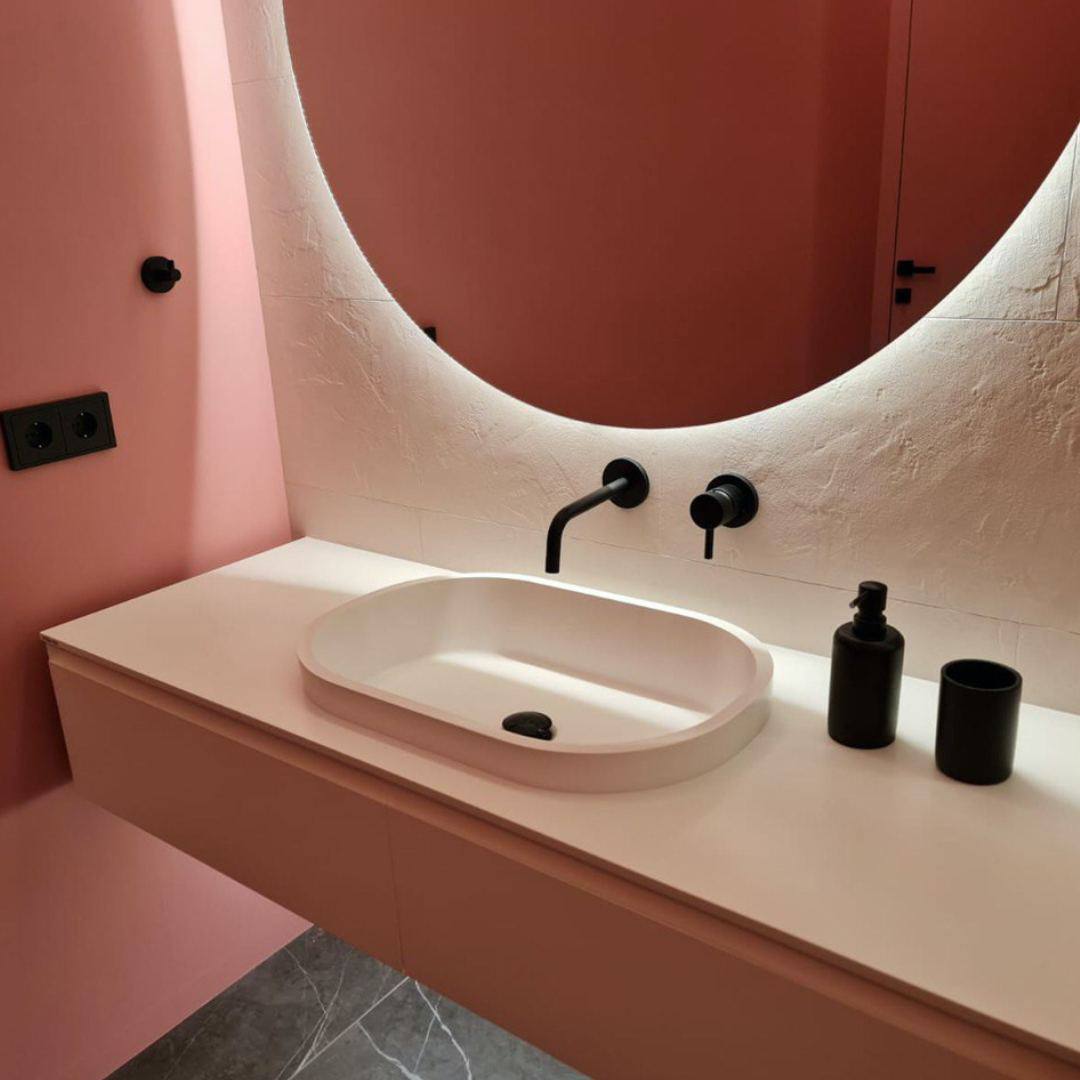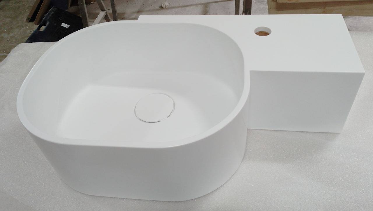 Раковина Kolpa-San OLIVIA со столешницей. Вся конструкция изготовлена из акрилового камня Kerrock по индивидуальному заказу.