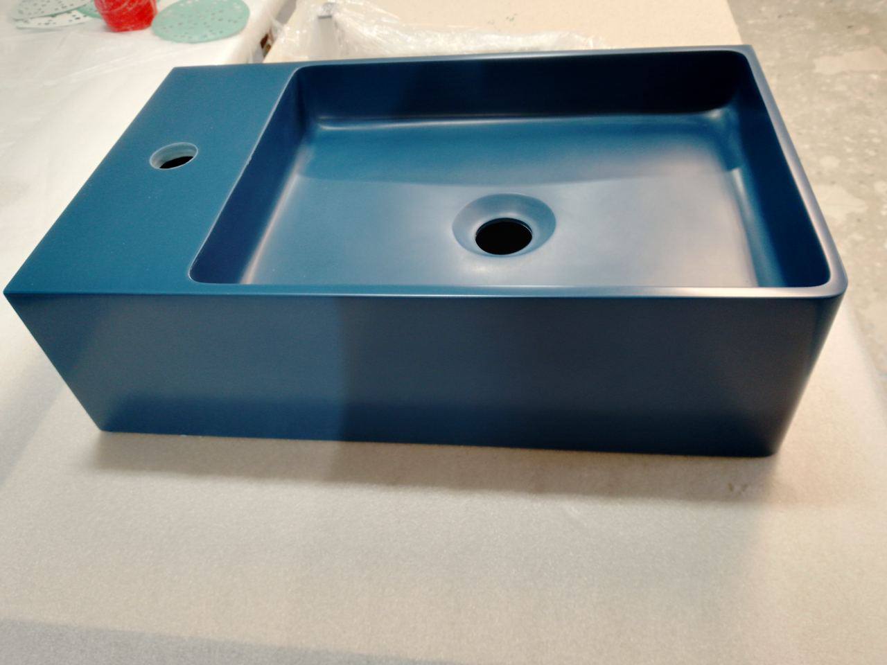Раковина MINI из акрилового камня Kerrock в насыщенном цвете 737 Indigo. Изготовлена по ТЗ заказчика. Простая в уходе, непористая поверхность камня Kerrock идеально подходит для ванных комнат.